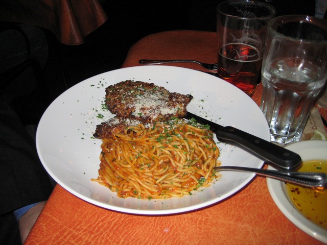 Last but not least, the Husband branched out (since I ordered the Pollo Bianco) and got the Pollo Romano. This included a sautéed, boneless breast of chicken with a Romano cheese and bread crumb crust, and thin spaghetti and tomato-basil sauce.