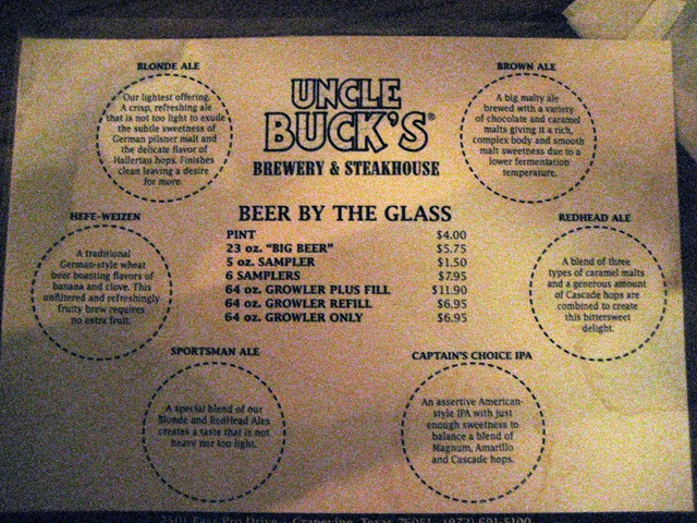 Saturday morning the Husband and I visited with our dear friends we met just a year earlier on our river cruise down the Danube. We had a wonderful time catching up on the past year and enjoying a delicious home cooked brunch. The Husband then dropped me off for my meetings while he headed into the city to see what Dallas had to offer. Once my meetings were done for the day, the Husband, some of my colleagues and I headed over to the Grapevine Mills shopping center, just north of the airport, in search of dinner. Using my handy iPhone, I came across Uncle Buck’s Brewery & Steakhouse and knew that was the one.