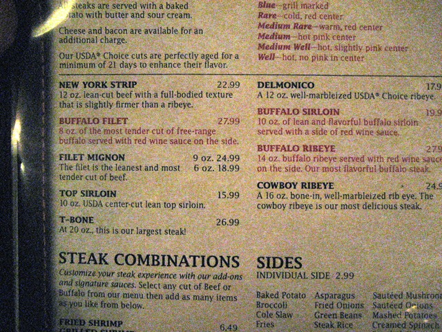 Most, if not all, of the group decided to go with Buffalo per the menu’s recommendation (in red). I went with the Buffalo Filet (I love filets – they’re my favorite cut). It was 8oz of steak with a red wine sauce on the side. I ordered mushrooms to top it with and a side of asparagus. The cup of mushrooms was insanely large! This meal was quite enjoyable.