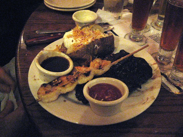 The Husband went with the Sirloin (I think!). He added grilled shrimp and had a loaded baked potato on the side.