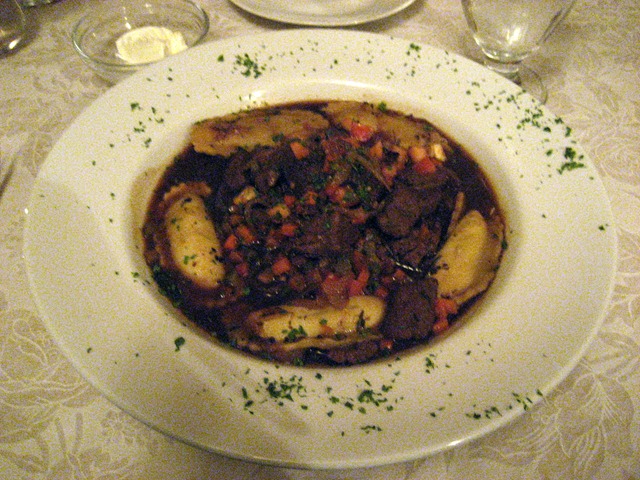 Two of the items I debated about getting were ordered by the Husband and one of our friends so I went with the first item that caught my eye – the Portobello Mushroom Agnolotti with Braised Beef. They described them as pasta purses stuffed portobello mushrooms topped with beef braised in a rich red wine demiglace. The agnolotti were heavenly! I shared one each with the Husband and one of our friends, as I planned on having a taste of each of theirs but I would have loved to eat each one myself!