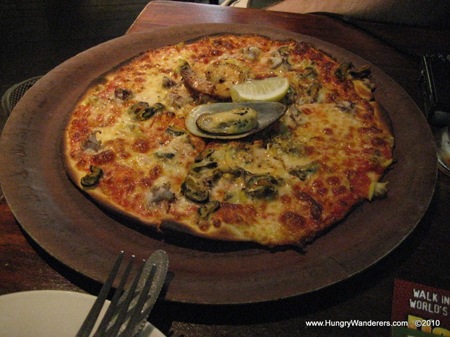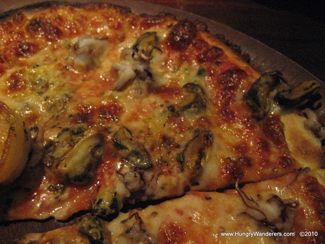 For our meals, we decided to share a pizza and a pasta and to each get a salad. The waiter suggested bringing out the pizza first and then the salads and pasta at the same time. To start, we had the Mare Fantasia pizza. We could select from a small, medium or large (4, 6, or 8 slices) and chose the Medium. The pizza was thin crust with tomato, mozzarella, mixed seafood and topped with New Zealand mussel and prawn. We thought it was funny that there was literally a mussel and a prawn. Additionally, when we asked the waiter later what was on the pizza (specifically we were wondering what the “mixed seafood??? was but didn’t explicitly say that), he said “seafood.??? We laughed and asked him to clarify. It appeared to have shrimp, mussels, octopus/squid, and possibly scallops. This pizza was fabulous! We enjoyed every last bite ![]()
