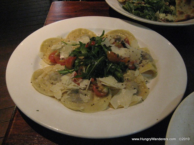 The pasta we selected was the House Made Raviolli filled with lamb ragu and served with truffle oil. We enjoyed that the filling really was as described – a lamb ragu – chunks of lamb and not a puree filled with cheese. This was quite flavorful. In the center, there was also a rocket and tomato salad (rocket seems to be the lettuce of choice here).