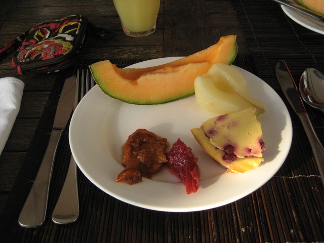 I personally tried almost some of every type of fruit! We were promised toast with our hot meal so we didn’t touch the bread on the buffet, but it sure did make our mouth water! Quality bread has certainly been lacking during our vacation… our options have mostly been “white??? or “raisin.??? On my fruit plate, I had (clockwise from the top) cantaloupe, pear, a baked yogurt & berry pudding, rhubarb, and dried fruit poached in orange juice. This breakfast was off to an amazing start!