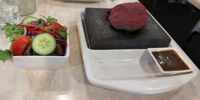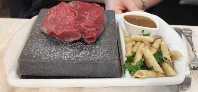 For our main course, we had an option of steak, chicken, or seafood and an option of salad, vegetables, or pasta salad. We also had a selection of sauces to choose from. Just like our awesome meal at the Raging Bull, the meat was brought out on extremely hot stones for us to cook to our liking.