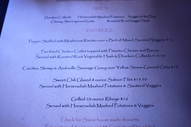 As for Savor, the Husband and I definitely recommend it. The food is tasty and very reasonably priced and the service is excellent. Our waitress was very friendly and attentive and when Matt’s fish turned out to be overdone, they were reasonably apologetic and worked to make it right. If we planned to be here longer, I think we’d definitely head there again!