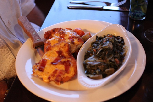 For our entrees, the Husband went with the Pan Fried Chicken and Drunken Greens. The chicken was fried and topped with cheese and bacon. While the chicken was a little over fried for his taste, he really liked the topping. The Drunken Greens were collared greens in a broth and perhaps some bacon. We both really liked this!