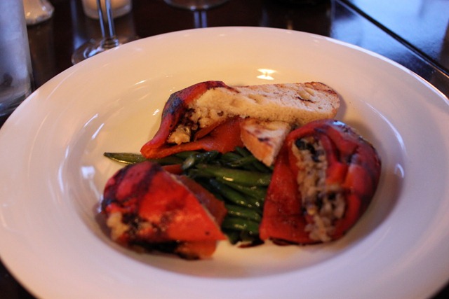 The entree I ordered was the Pepper Stuffed with Mushroom Risotto over sauteed vegetables. The online menu noted Yellow peppers but the restaurant menu just said “Pepper??? so I expected Red. The peppers were nicely roasted with the skin removed and the risotto was rich and creamy. The veggies of the night were green beans, sugar snap peas, and carrots (some nights they have brussel sprouts and/or asparagus). They seemed to be glazed with a balsamic vinegar. This dish totally met my expectation and I’m quite glad I ordered it! For any vegetarian readers, the waitress confirmed that this dish is completely vegetarian.
