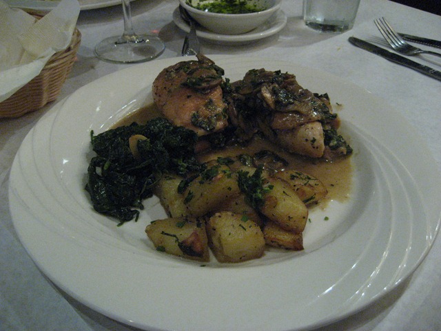 His mother ordered the Pollo alla Fiorentina (a dish I was definitely eyeing). It was a chicken breast stuffed with spinach, mozzarella, prosciutto and mushrooms served with roasted potato and spinach. She said it was excellent!