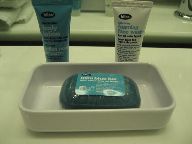 Ok, back to the room! I’m a fan of checking out the toiletries hotels provide. Aloft had foaming face wash (loved it!) and some body lotion and the usual soap at the sink. ![]()