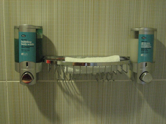 In the shower, there were large dispensers of body wash (also a fan) and shampoo/conditioner. While I didn’t use the shampoo/conditioner (I prefer separate, not 2-in-1), I love the earth friendliness of the mass dispenser (like a cruise ship).
