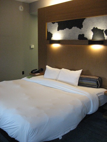 As some of the reviews I’d read said, it felt like they were trying too hard to be trendy. Check-in was quick and easy, though, and we were soon headed up to our room. The elevator was dark (were we in a club?) with a bright blue floor.
