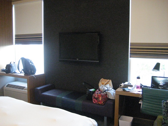 Facing the bed, there was a shelf, a bench and wall mounted television, and desk. There was sufficient room to walk around and we were generally impressed with the economical use of space. The only frustration was that our tv would randomly lose sound, but we didn’t let it bother us (not enough to call the front desk and ask for help).![]()