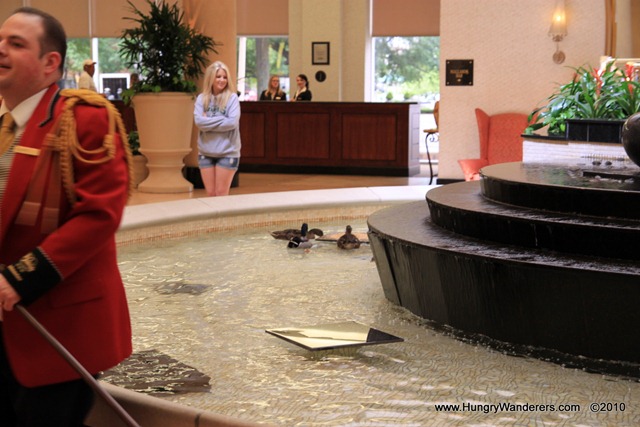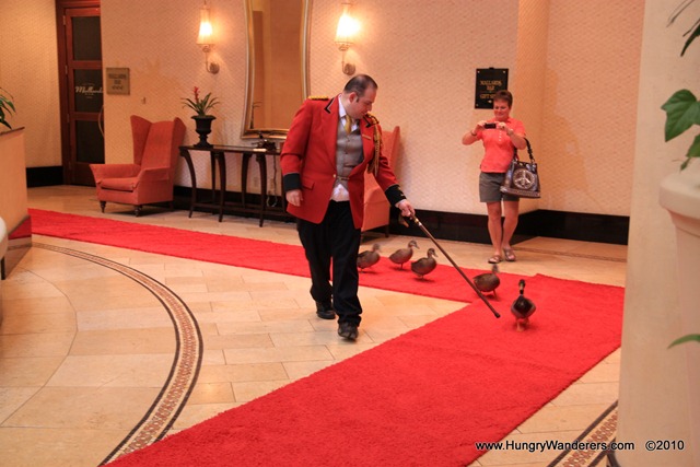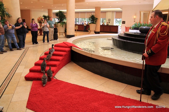 With John Philip Sousa’s King Cotton March playing in the background, the ducks (one male and four females) follow their Duck Master along a red carpet (an actual carpet) to their fountain.