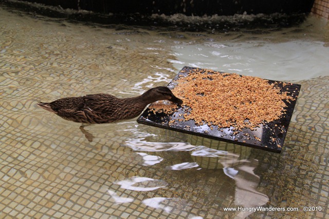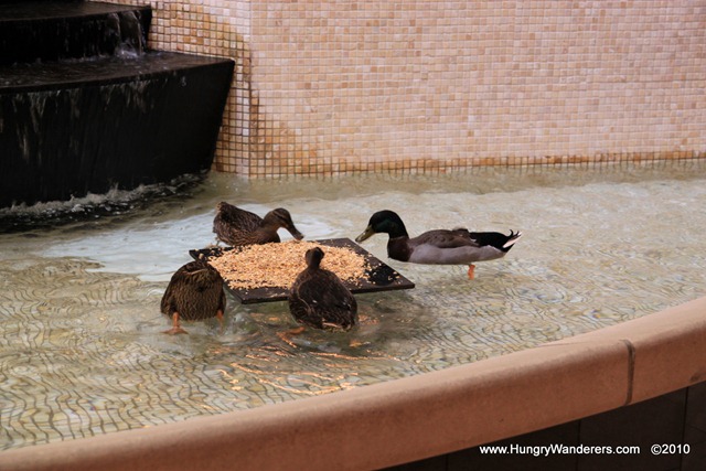 We spent a handful of minutes enjoying watching the ducks swim, bathe, and eat. We learned from Keith that the ducks are raised on a local farm for all of the Peabody Hotels. They’re raised in teams of five – one male and four females. They spend about a year at the hotel before heading back to the farm for a number of months (if not longer) of rest and relaxation. They stay in reserve at the farm in case anything happens to any of the other teams. For example, the current team worked previously at the Peabody Little Rock and had been back at the farm when the last team had a female who began limping. You can’t replace one duck on a team as they are territorial so the whole team leaves and another one comes back. We found this to be fascinating!