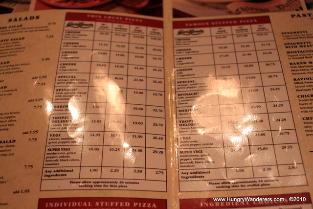 Our waitress headed back to the kitchen and both pies were ready to go. (I only took a picture of one because they look the same at first!) We ordered two mediums for the six of us – one cheese and one with pepperoni and mushrooms.