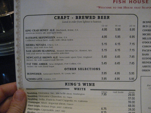 Inside, there was no wait and we were seated promptly by the friendly host staff. Then we began looking over the menu… which is huge. As people who like seafood, but don’t eat it often, the menu was actually a bit overwhelming. Personally, I want to branch out and try more fish, but at $20 or so per entree, it makes me nervous to order something I haven’t tried before. (What’s your favorite type of fish to order at a restaurant?)