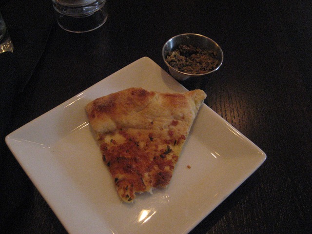 Tonight, they had a special of a 3-course menu for about $30, a 4 glass wine flight for $16, and $2.50 margaritas (I believe that was the drink). We turned down the specials and contemplated for a while over the menu. Our waitress was super patient as we were busy catching up (haven’t seen my friend in a year!) in between trying to figure out what to order. As we contemplated, she brought us a basket of soft, doughy bread and olive tapenade. (It looks like pizza but it’s not!)