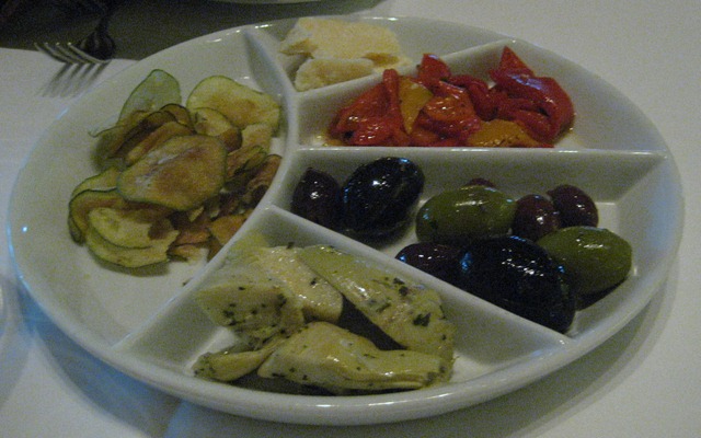 As we waited for our first course, we were brought an antipasti plate. Starting at the left and going clockwise, there were zucchini chips, a flavorful cheese of some sort, roasted red peppers, green and black olives, and artichoke hearts. We particularly enjoyed the cheese and roasted red peppers.