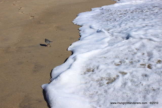 Over the past few years, the Husband and I have been to the Outer Banks, specifically Nags Head, North Carolina, a handful of times together. We were married there in March 2008, had a trip there prior to that to plan the wedding, and now two trips around Labor Day with our family and friends. We love the Outer Banks and hope to own a beach house ourselves one day. Unfortunately, during most of our trips, we’ve had poor weather. That didn’t hurt the vacations too much as we enjoy just hanging out in the beach house, lounging in the hot tub, and listening to the sounds of the ocean. However, the weather on this month’s vacation was beautiful and we enjoyed every second of it. We took a handful of walks on the beach and I fell in love with these little birds, perhaps sand pipers?, who run all along the water’s edge feeding, but scurrying away as fast as possible from the waves. Our last morning at the beach, I knew I had to get out to get some pictures to remember the beautiful beach by.