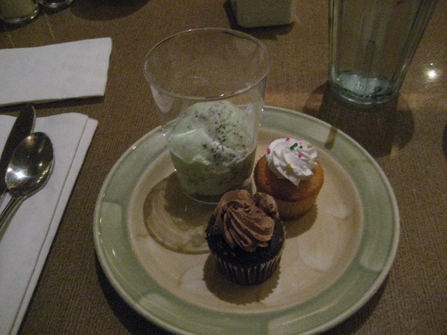 In general, the regular buffet was just okay. However, they had a big display case of ice cream and after tasting the Husband’s scoop, I had to go back and get a cup of my own. I got a single scoop of mint chocolate chip ice cream and two mini cupcakes (I love the mini ones! You get the taste without overdoing it).