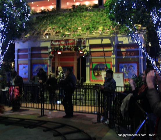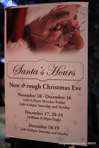 While we waited for the kids to get onto the train (the line moved quite slowly) we admired the decorations around us. Although we didn’t see the big man himself, Santa is available for visits and photos according to this sign and Santa’s house where one can pick up their photos.