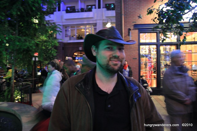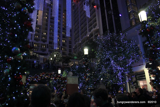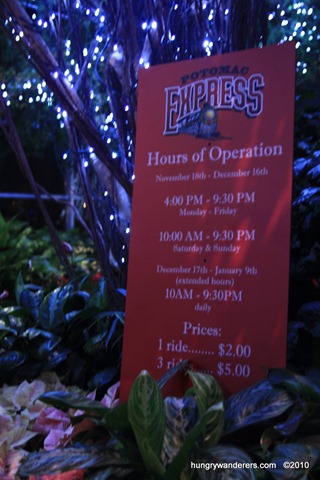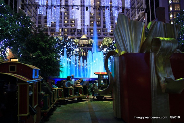 After a relatively easy drive from my parents’ house (minus a bit of traffic around East Capitol Street on 295), we followed the very helpful signs to the National Harbor (if you aren’t familiar with it, it’s right at 295/495 on the Maryland side of the Wilson Bridge). We followed signs to one of the parking garages, and made our way through the chilly wind to the other end of Waterfront Street where the hotel is located. Our friends were already there so we found our way to the Christmas tree and Potomac Express train.