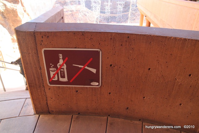 Parking at the dam is quite easy and only $7 per car (paid in advance with cash when entering the garage). As we meandered down the stairs of the garage, we came across this sign which gave me a giggle. I believe the prohibition on the left is of alcohol which I assume needs to be clarified since alcohol is allowed outside on the Strip (not so at national parks!).