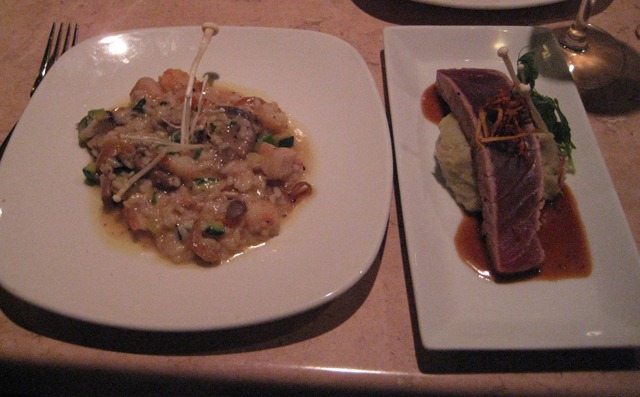 For our entrees, we ordered the Seared Rare Ahi Tuna over wasabi mached potatoes and soy garlic sauce. Our other selection was a seafood risotto with mushrooms and zuccini.