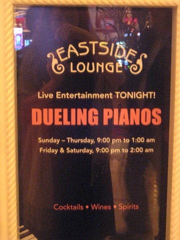 About two weeks ago, you may remember that we celebrated our friend’s birthday at Pamplemousse. After our wonderful dinner, four of us headed to the Strip to continue the party with dueling pianos. We headed over to the Encore’s Eastside Lounge where there are dueling pianos at night.
