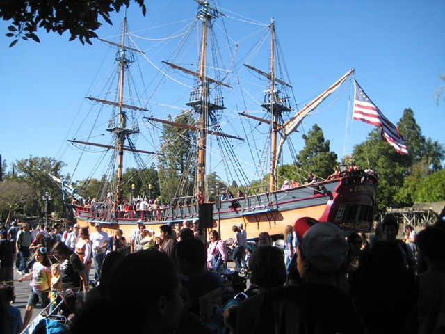 Back to New Orleans Square (Disneyland is so much smaller than Disney World, land-wise, so it was so easy to walk between sections quickly)… as we walked up a giant Pirate ship floated by. We’re not particularly happy about the pirate ship – it seems too big for the body of water it’s in and I think it has caused Mark Twain’s Riverboat to be shut down. Uncool pirates!