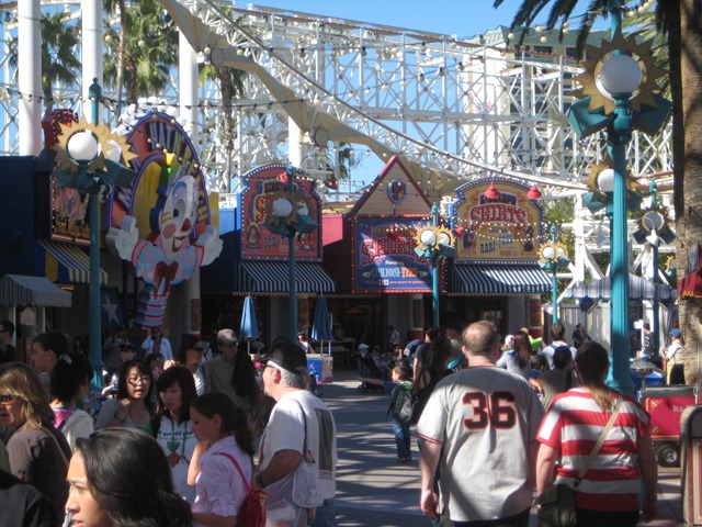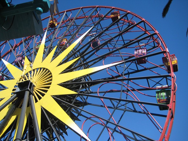Next we headed down to Paradise Pier which is designed like an old time California boardwalk. There’s a roller coaster, ferris wheel, food, games, and the Toy Story ride (one of our favorites but the wait is TOO long so we remembered our experiences at Disney World and saved our time for other rides). First up was the roller coaster. It looks like an old rickety wooden roller coaster but is super smooth. It has Disney’s first upside down loop.