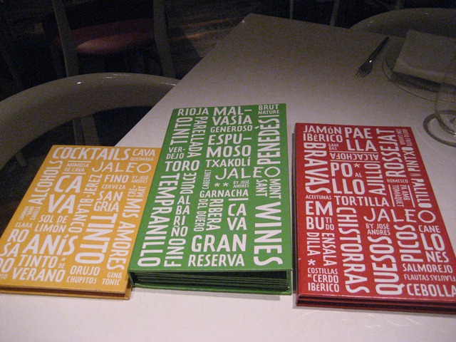 The menus were color coded – red for food, green for wine, and yellow for cocktails.