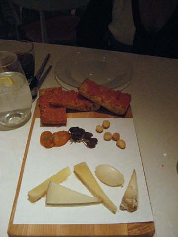 First up, we got a cheese plate – since a selection of 5 was a great deal, we decided to do that. There were 7 cheeses to choose from so instead of choosing 5, we chose 2 not to have. The cheeses also came with some bread topped with a light tomato sauce, dried apricots, raisins, and some nuts. In general, the cheeses were goat and sheep cheeses. I don’t remember which was which, but they were all good! (The ones we didn’t have were the blue cheese and one other?)