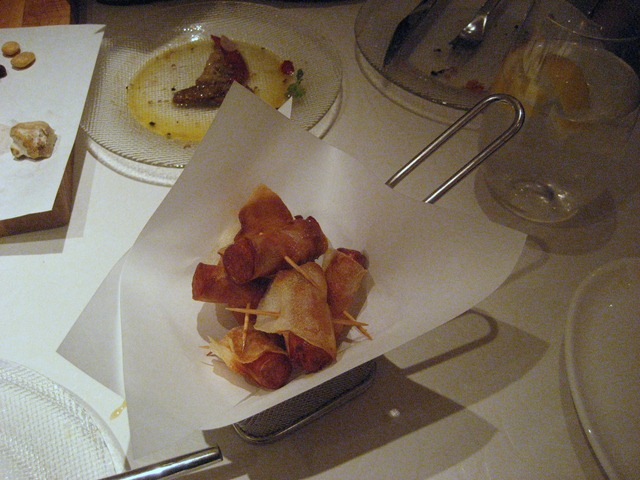 Our next two choices were less healthy – both fried. First, we had the Chistorra envuelta en patata fritta which was slightly spicy chorizo wrapped in crispy potato (aka a potato chip). This was good but not my favorite.