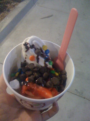 The toppings selection was similar to many serve-yourself places – fruits, candies, cereals, etc.. On top of my three flavors, I had fresh strawberries, mini M&Ms, Ghirardelli chocolate chips, and a bit of Ghirardelli chocolate syrup. I headed to the cash register, got a spoon, and since it was so crowded inside, headed to my car to enjoy my dinner ![]()