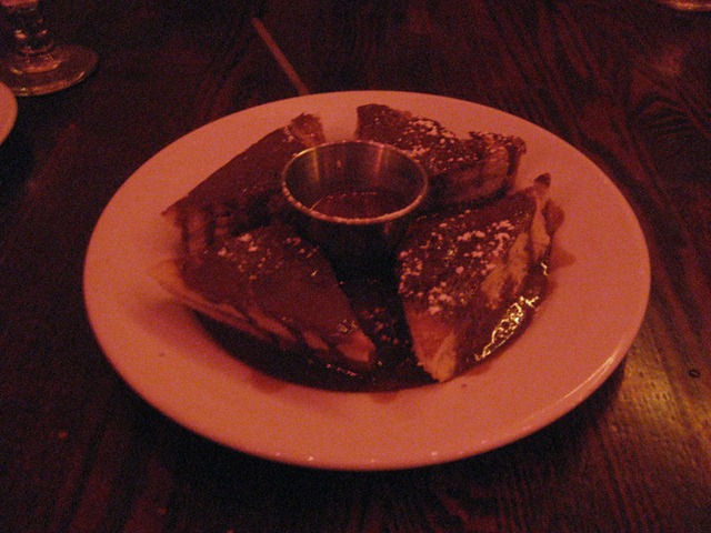 Now, at this point, we were happily full. However, something had caught my eye on the dessert menu and I figured the four of us could each enjoy a bite or two of a tapas dessert. They all agreed so we had the Banana-Nutella sandwiches with a nutella cream dipping sauce. It was as good as it sounds!