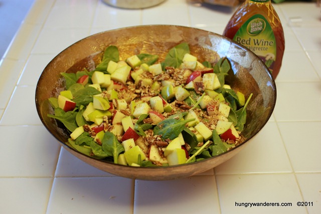 After planning out the rest of the menu, I decided to pair the Fat Tire with a salad described by Melissa Newell who the website lists as being the owner of Terroir Restaurant. It was a simple spinach salad with apples, spiced pecans, and a vinaigrette. She recommended a sherry shallot version but I chose a red wine vinaigrette.