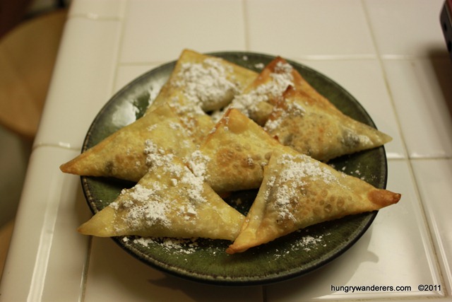 After double checking with the guys that they like bananas and chocolate, I googled “banana and chocolate dessert” and was inspired by the Chocolate and Banana Dessert Wontons recipe on Appetite for China. All you need is ripe bananas, good chocolate, wonton wrappers, some oil, and powdered sugar. I used Nasoya’s wonton wrappers (located in the vegetarian refrigerated section for those unsure where to find it in their grocery store – I used my trusty iPhone to find them) and I think they’re smaller than the ones the recipe used – I could barely fit a teaspoon of mix in them but they were still delicious. The guys loved them and they went well with the Abbey. (I even made these again a week later – very easy to make!).