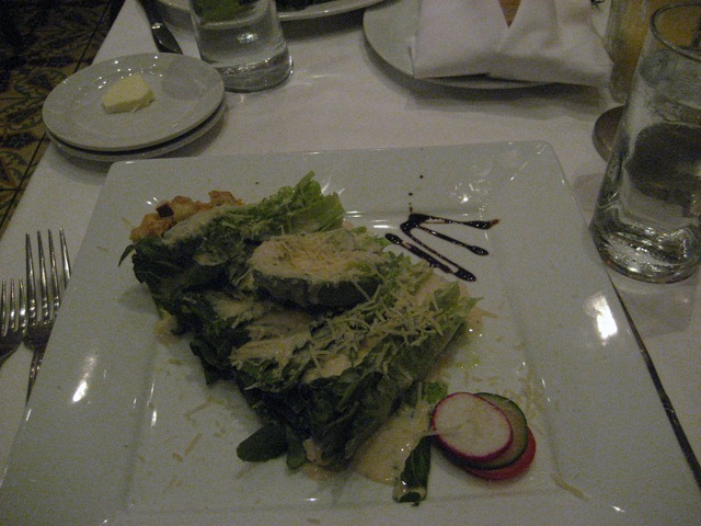 As I mentioned above, I ordered the Caesar Salad as my second course (which the Husband also ordered for his first course). At first it looked pretty good – a mix of romaine, Caesar dressing, shaved parmesan, and some avocado (and I